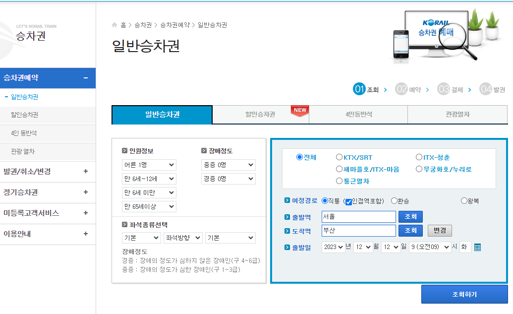 출발역과 도착역, 출발일, 인원수 등을 입력합니다.